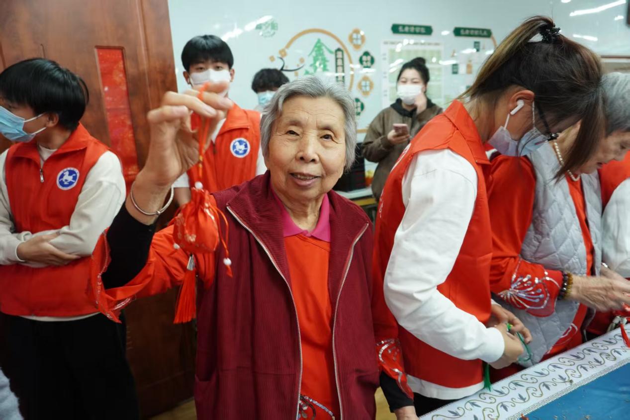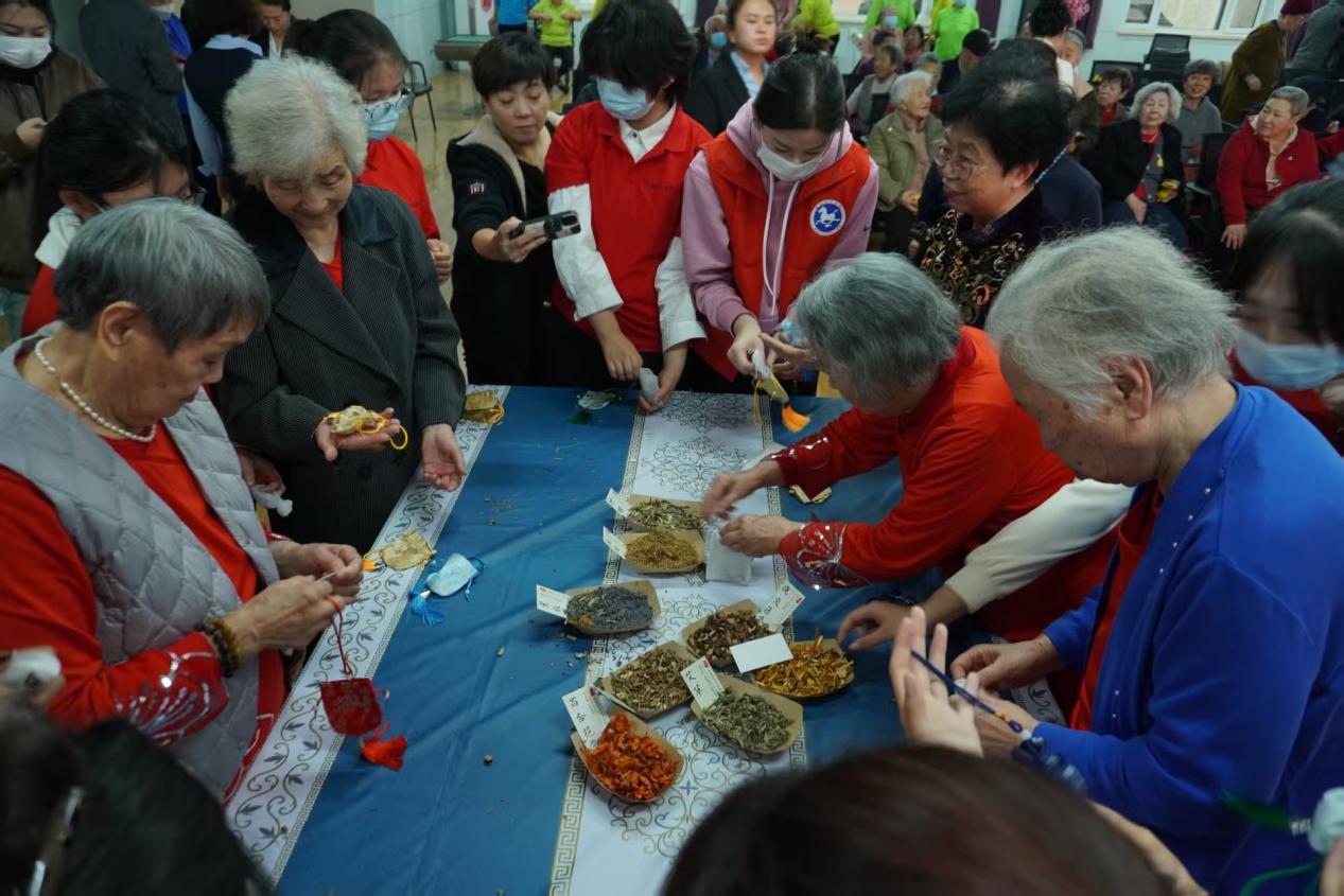 “茱萸辟邪,菊酒延年”的民俗智慧,在手工制作环节转化为可触摸的文化实践。志愿者提前筹备艾草、茱萸等天然香料及香囊材料,不仅向长者讲解香囊的节日寓意,更细致拆解 “选料 — 填充 — 缝缀”的制作步骤,将传统养生文化与手工技艺传递给每一位参与者。长者们专注挑选香料、亲手制作香囊,指尖的温度融入布料,淡淡的草木香气中,既有动手的乐趣,更有对传统文化的认同与传承。这份 “专属香囊”不仅是节日礼物,更是连接传统与当下的文化载体,让敬老活动兼具情感温度与文化深度。
