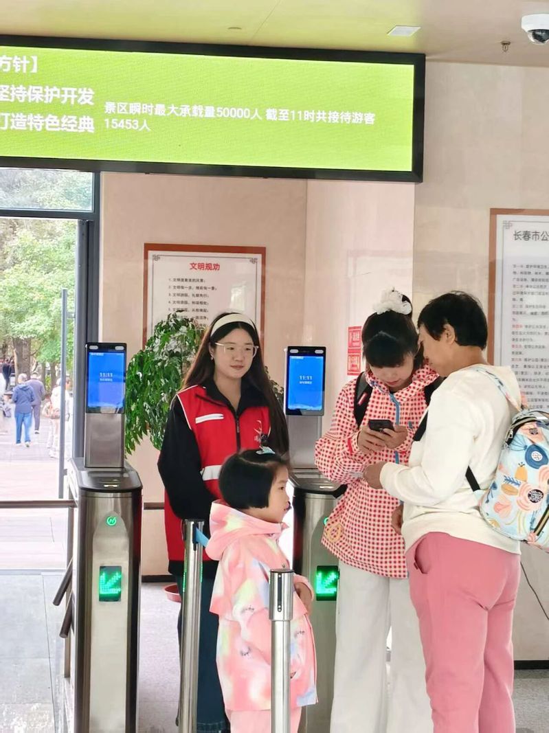 与此同时,净月潭景区内,志愿者们同样步履不停,忙碌的身影成为一道亮丽的风景线。他们穿梭在景区入口、步道沿线与休息站点,只要看到游客面露迷茫,便主动上前,热情地提供路线指引与景点讲解;发现地面有垃圾,二话不说弯腰清理,只为维护景区的整洁美丽;遇到行动不便的老人或孩童,第一时间上前搀扶护送。一个个贴心的举动,如春风化雨,让游客的旅途充满安心与温暖。