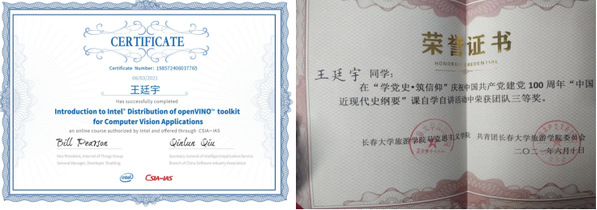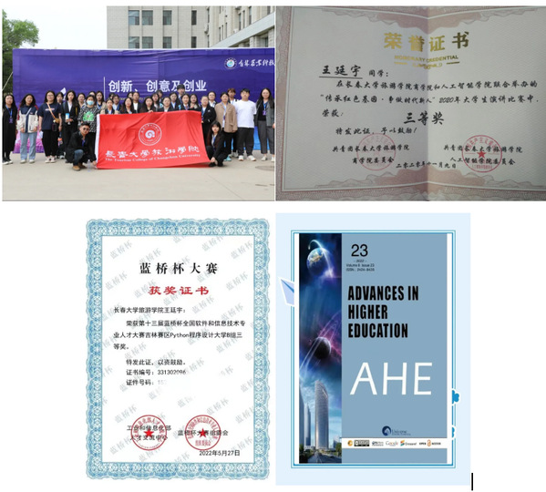 从竞赛新人到领域标杆的蜕变之路,印证着我对技术边界的持续突破。大一时,以防疫志愿者身份积累200+小时服务经验,同时在三创赛与人工智能演讲赛中初试锋芒,完成了从理论到实践的认知启蒙;大二迎来爆发期,在蓝桥杯Python组斩获省级奖项,带领团队打造智能旅游系统摘得挑战杯省赛银奖,期间将马克思主义理论与技术伦理深度结合的作品斩获微视频大赛桂冠;大三实现技术跃迁,计算机设计大赛双赛道省级奖项与吉林省机器人大赛自动驾驶冠军的取得,标志着算法工程能力的成熟,同期在核心期刊发表的VR冰雪旅游平台论文展现学术研究功底;大四厚积薄发,数仓项目问鼎计算机设计大赛省赛金奖,并在东方国信公司的国家电力数据治理项目中完成从校园到产业的完美衔接。这段从0到1的进阶轨迹,正是对“持续精进”的最佳诠释。