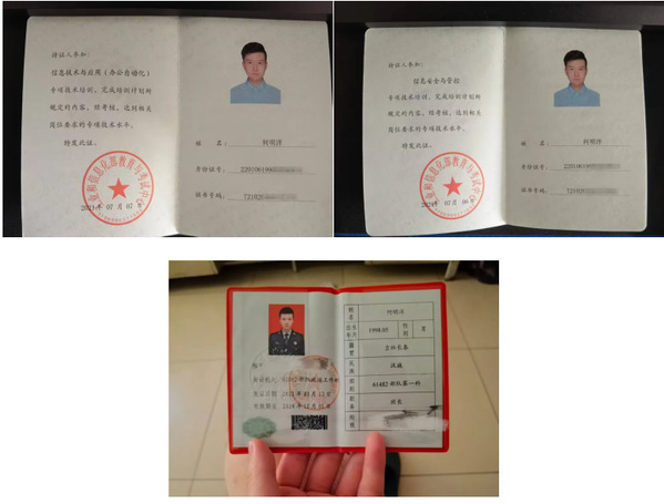在部队期间,曾在网络空间部队育鹰杯演讲比赛中荣获第三名,荣获网络空间部队微课比赛二等奖和骨干座谈演讲比赛二等奖,考取工业和信息化部《信息安全与管控》、《信息技术与应用》证书。2023年,前往战略支援部队航天工程大学进修,完成网络管理与维护、网络安全专业学习并毕业。