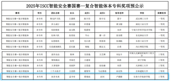2025 年 10 月 25 日,物联网工程专业学生在全国大学生信息安全与对抗技术竞赛(ISCC)智能安全赛国赛---复合智能体赛道中勇创佳绩。本次赛事聚焦“智能体协同与安全防御”前沿领域,吸引全国百余所高校队伍激烈角逐。物联网工程专业24级学生孟令奇、蒋瑞宸、沈钊最终获全国三等奖。评委点评指出作品在智能体协同效率、复杂场景适应性等方面的优化方向,勉励团队持续深耕,为网络安全智能防御领域贡献更多创新方案。