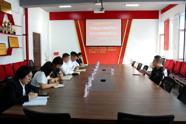 为进一步深化校企合作,搭建高质量学生实习实践平台,助力我校物流管理专业人才培养与行业需求精准对接,推动学院就业工作的全面开展,2025年9月15日下午,我校商学院与京东物流华东区召开关于学生实习就业的交流座谈会。商学院院长张家成、党总支书记王磊、副院长孙丽男、党总支副书记刘鹏、院长助理郑怡婷、物流教研室主任刘瑀瑶及2023级物流管理专业辅导员陈星羽参会,京东物流华东区人资组张引弓经理受邀出席,双方围绕学生实习就业合作事宜展开深入交流。