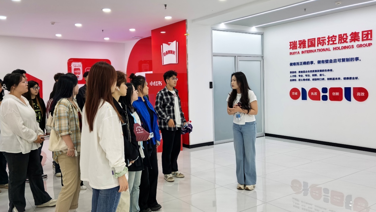 瑞雅集团是一家以传媒贸易为主的专业整合营销商业机构,主营业务有快手电商产业、补养堂品牌电商运营、抖音全域运营、各平台直播等。在人事经理的带领下,同学们参观了瑞雅集团电商经营工作区域,了解瑞雅集团的公司运营以及核心部门和员工组成。