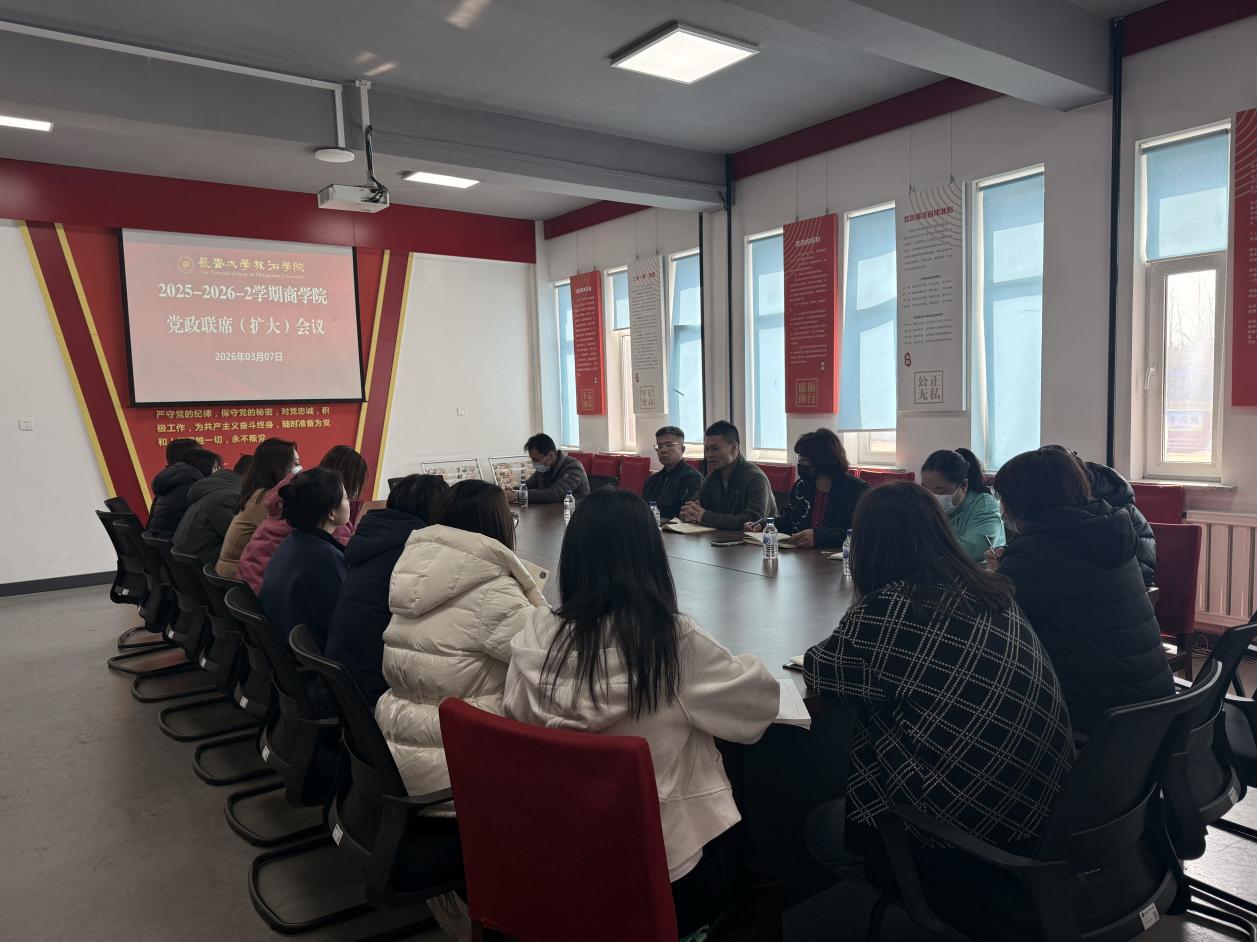 为统筹推进新学期各项工作,明确发展方向、凝聚育人合力,商学院于3月7日在综合楼208会议室召开新学期党政联席(扩大)会议,围绕新学期工作调整、2026年教学工作要点及“十五五”规划编制等重点工作进行了研讨和全面部署。学院领导班子、各教研室专业带头人及教研室主任共同参会,本次会议由学院党总支书记王磊主持。