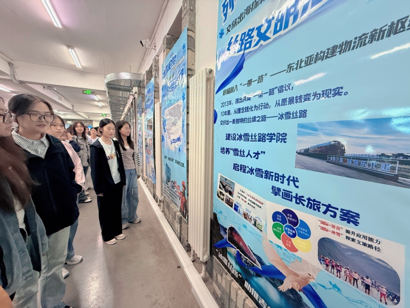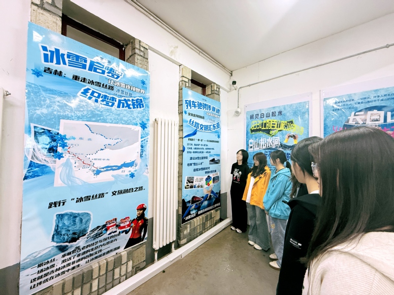 在“薪火相传”板块中,系统梳理并展示了近期以“守护城市文脉,铭记历史沧桑”为主题的代表性非物质文化遗产项目,充分展示了非遗保护工作的最新成果。该板块特别融入学校开展的系列红色文化教育实践,通过将东北抗联精神等红色基因引入展览叙事,为师生的“学、思、践、悟”构建起沉浸式育人场景,既彰显吉林文旅的焕新态势,又体现非遗保护与红色教育在传承历史文脉中的深度融合。“冰雪交响”板块则聚焦吉林省“文旅出海”的创新实践,打造“上合组织实训班”及东北亚长旅号人才培养的“移动式课堂”,以服务“一带一路”倡议、建设“冰雪丝路”为战略引领,擘画东北亚全域文化出海的“长旅方案”,有力彰显吉林省文旅的前沿探索。在此基础上,该板块依托吉林省世界级的粉雪资源与深厚的冰雪非遗底蕴,巧妙融合冬捕渔猎、鱼皮制作等鲜明地域特色项目,生动呈现其通过创造性转化赋能冰雪旅游产业的创新路径,为吉林省打造了一张亮丽的“冰雪文化名片”。