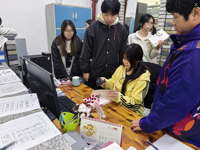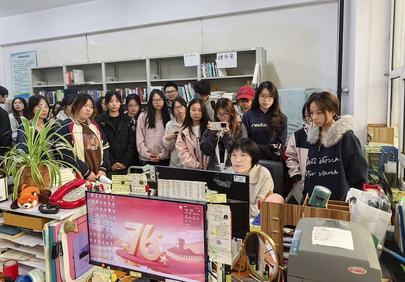 图书馆副馆长卢冬岩带领同学们开启图书生命之旅探秘。同学们在图书馆文献资源建设部近距离观摩并参与图书数据录入、物理加工等环节,直观了解图书从采购到上架的全流程。这种“后台视角”的实践,打破了学生对图书馆的单一认知,使其认识到文献管理背后严谨的学术规范与技术支撑。图书馆流通阅览部馆员向同学们讲解了图书排架规则,演示了图书借还系统的操作流程,同学们亲手操作之后,对图书馆的日常管理工作有了更直观的认识。