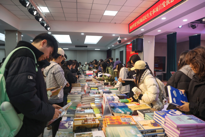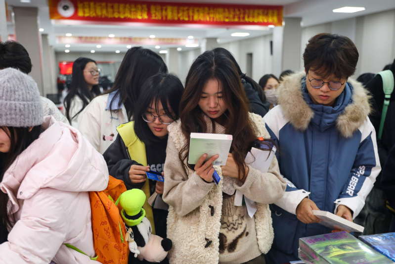 活动现场,数千册图书整齐陈列,涵盖《习近平谈治国理政》等重点出版物、四六级备考指南及考公、考研辅导书、文学名著等畅销图书。活动现场洋溢着书香与暖意,同学们手捧着选定的书籍,笑容洋溢,大家纷纷表示:“这样的活动真是把文化实惠送到心坎上!不出校门就能挑选喜欢的书,专业书补学业短板,文学书缓解学习压力,以前总担心买书超预算,现在有了购书卡,终于能把想读的书都带回家,心里特别暖!”