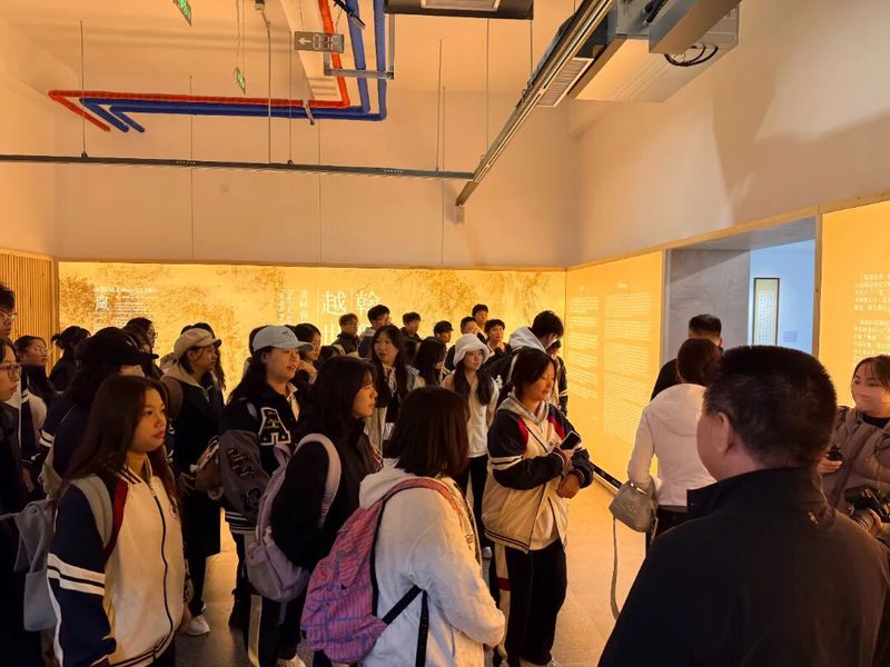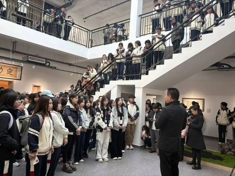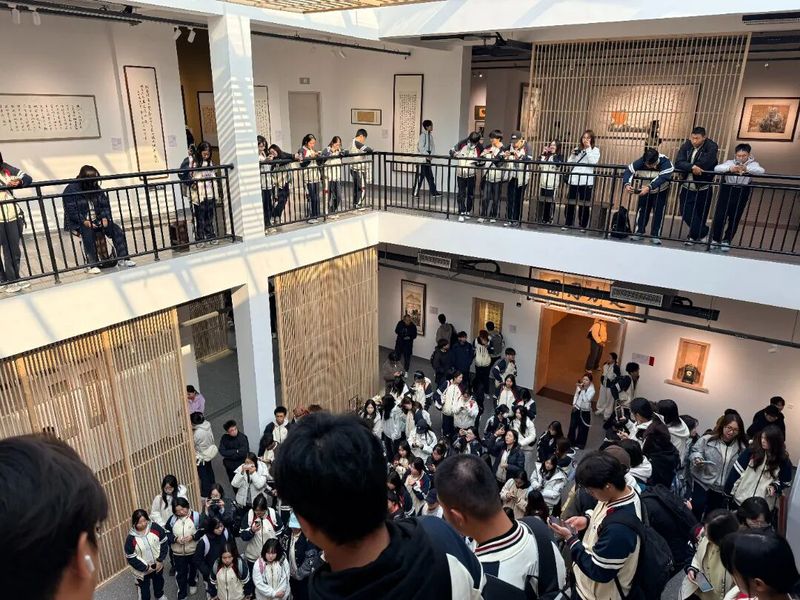 学生们行走在现代感十足的展厅与温润的木饰之间,感受着《野亭消夏图》的雄浑篆意、《书法五言联》的禅意笔墨……触摸历史的艺术脉动,让艺术的观赏升华为一场跨越时空的对话。