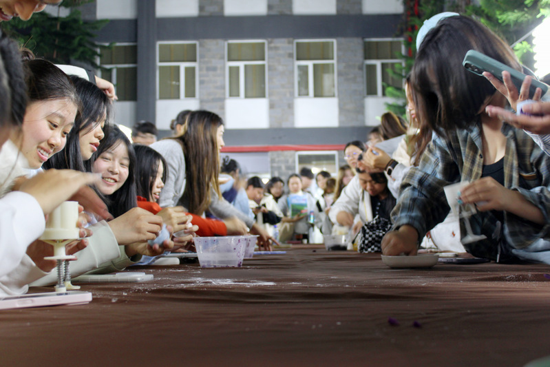 随后,月饼DIY环节温馨开启。新生们围坐在一起,手中拿着面团、馅料和模具,互相交流着制作技巧。有的同学小心翼翼地揉着面团,有的专注地调配馅料,还有的创意十足地在月饼上印下“国庆快乐”“中秋团圆”的字样,将对双节的美好祝福融入每一个亲手制作的月饼中。空气中弥漫着月饼的香甜,也充满了同学们的欢声笑语,温暖的氛围感染着在场的每一个人。
