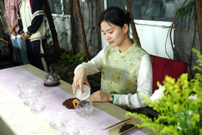 精彩的歌舞表演过后,咖啡文化及茶文化讲解及互动环节便温馨接档。专业教师董博向学生们演示从烘焙到萃取的全流程,他特别强调:咖啡不仅是饮品,更是连接全球酒店服务的文化纽带,学生们在掌握手冲技巧的同时,更要理解背后百年贸易史与当代精品化趋势。酒店管理专业的张雪老师手持茶具,一边熟练地演示泡茶技艺,一边细致讲解茶文化的历史渊源与深厚底蕴:“一片茶叶,从采摘到冲泡,蕴含着古人的生活智慧与审美追求。”老师的讲解生动有趣,同学们听得格外认真,品茶环节的时候同学们纷纷提问:“老师,不同种类的茶叶冲泡水温有什么讲究呀?”“茶文化在现代酒店管理中有哪些应用呢?”老师耐心细致地一一解答,在问答互动间,同学们对中华传统文化的雅致魅力有了更深刻的理解。