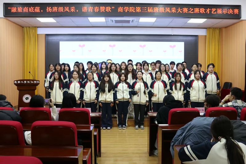 为彰显班级风采、凝聚集体向心力,丰富校园文化内涵,11月27日,商学院于筑梦报告厅成功举办“融旅商底蕴,扬班级风采,谱青春赞歌”第三届班级风采大赛班歌才艺展示决赛。各参赛班级以歌寄情、以艺抒怀,充分展现青春朝气与团队协作活力。商学院团学组织委员会常委及部分委员、学生会全体成员出席活动,2025级全体班级积极参与、同台竞彩。