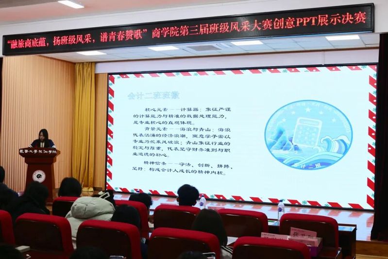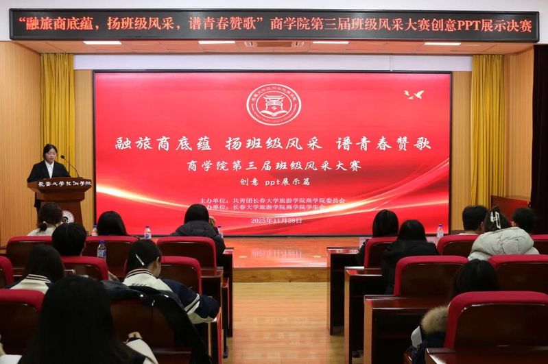 为响应学校“品牌深耕年”建设要求,融合长旅特色IP、彰显班级品牌魅力,同时深化“厚德修身”学生素质养成工程,达到一班一品,商学院于11月28日在筑梦报告厅举办“融旅商底蕴,扬班级风采,谱青春赞歌”商学院第三届班级风采大赛之创意ppt展示决赛。商学院团学组织委员会常委及部分委员,学生会全体成员及2025级部分学生出席本次活动。