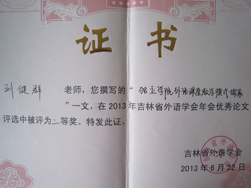 2013年6月22日-23日,吉林省外语学会在延边大学举行了2013年吉林省外语学会年会。本届年会优秀论文评选工作从2013年3月开始征集论文,学会共收到参评论文80余篇。专业组和大学外语组分别组织专家对论文进行了认真评审,最终评选出优秀论文31篇。在本届年会的优秀论文评选中,外国语学院日语教研室主任刘健群教授的《独立学院外语课堂教学模式探索》一文荣获优秀论文二等奖。
