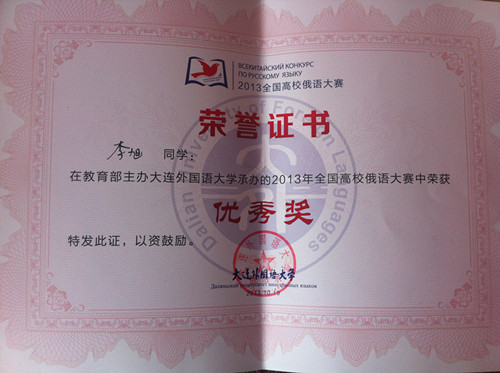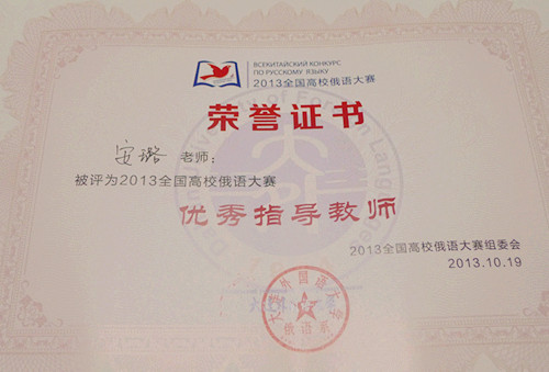 今年是我校俄语专业学生首次参加全国高校俄语大赛,经过我院田君、安璐、Ruslan等专业教师的精心辅导,学生的刻苦努力,代表我院参赛的王明飞、李旭两名同学,赛前准备充分,临场发挥出色,在单项演讲比赛中进入全国20强,分别荣获得本次大赛高年级组与低年级组的优秀奖,俄语专业教师安璐获得“优秀指导教师”称号。