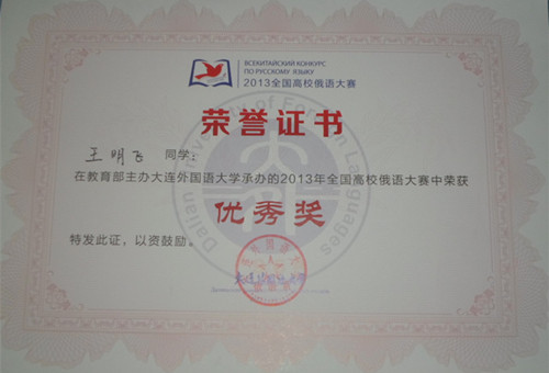 2013年10月20日,由教育部主办,大连外国语大学承办的“2013年全国高校俄语大赛”正式落下帷幕。为期两天的赛事汇聚了来自北京外国语大学、上海外国语大学、北京大学、中国人民大学、浙江大学等108所全国知名高校的283名俄语专业学生。