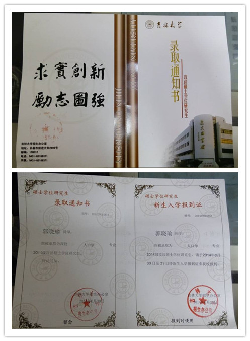 我院2014届毕业生日语专业的郭晓瑜同学已收到吉林大学人口学专业的录取通知书,在此对郭晓瑜同学表示祝贺,希望她在学业上不断进步,取得更好的成绩!