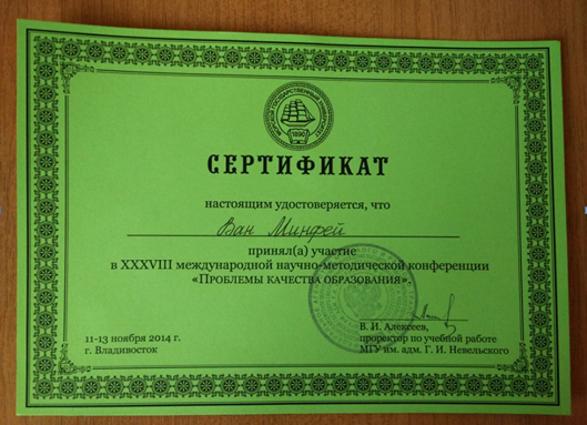 外国语学院2011级俄语专业学生王明飞于2014年9月代表我院在校生首批赴俄罗斯涅维尔斯基海事国立大学交流学习。到校后很快的适应了国外的学习生活,积极参加了2014年11月11日至11月13日在海参崴俄罗斯海事国立大学举办的“第38届国际教学研讨会:教育质量问题”,并在此次国际教学研讨会上表现突出,获得荣誉证书。我院于2013年10月与俄罗斯涅维尔斯基海事国立大学建立校际合作关系,王明飞同学是我院俄语专业选派的首批赴俄交流学习代表,该同学能在如此短暂的求学时间荣获俄方荣誉证书,充分展现了我院学子的风采并为学院争得荣誉。