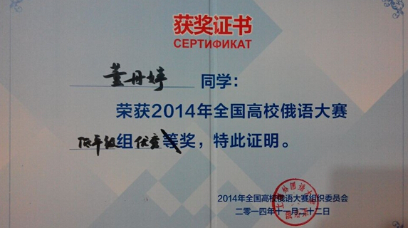 “全国高校俄语大赛”由中国教育部主办,从2006年开始已连续成功举办8届,为俄语专业学生展示所掌握的语言技能以及对俄罗斯文化、历史、传统的了解提供了良好的平台。通过参加本次赛会,极大的增强我院俄语专业学生的自信心,不断提高了学生自身的俄语实践能力和水平。