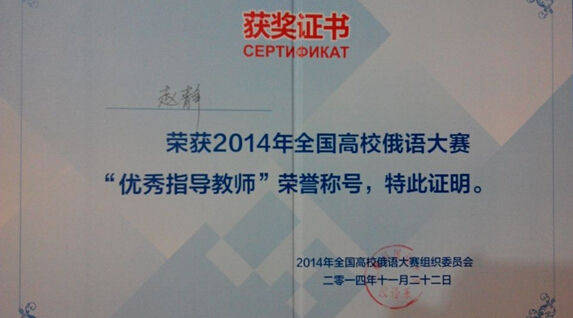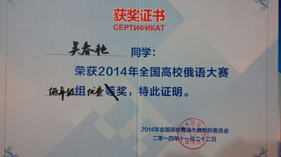 吴春艳、董丹婷代表我院参赛。他们赛前准备充分,临场发挥出色,分别荣获本次大赛高年级组和低年级组的优秀奖,俄语专业教师赵静获得“优秀指导教师”称号。