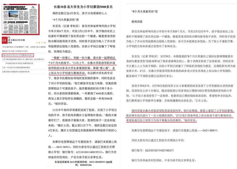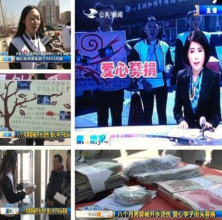 “爱心是水,浇灌那棵弱小的幼苗,请大家为这个八个月的孩子奉献一份爱!”3月21日上午,长春大学旅游学院外国语学院的30多名大学生拿着募捐箱,捧着“爱心板”,走上街头为小宇钊筹集善款。他们的行为就像冬日的阳光为他送去了温暖,给小宇钊的人生抹去了黑暗,带去了光明。此次爱心募捐活动得到了吉林卫视公共频道《第一播报》和《东亚经贸新闻》的关注,全程跟拍,记录下了每一个温暖瞬间。