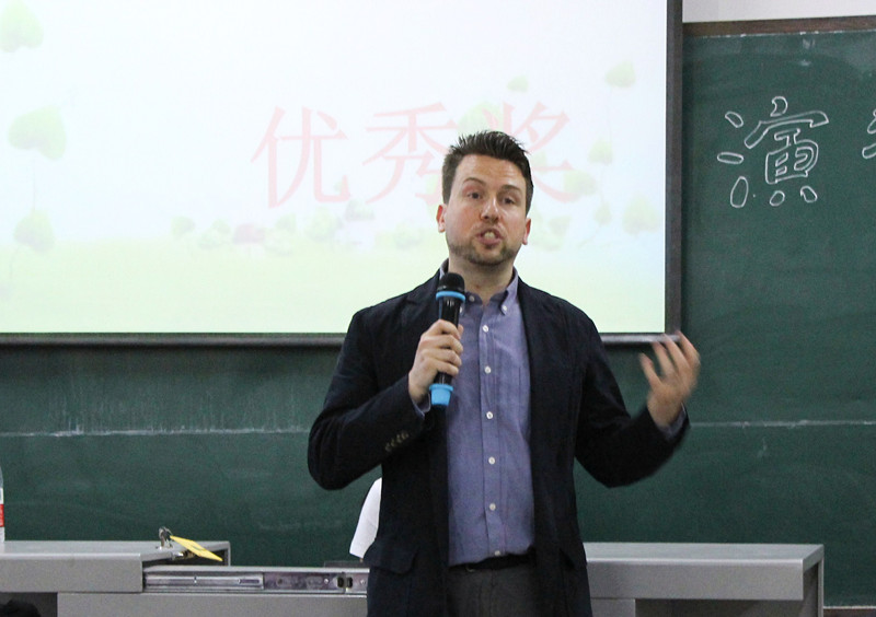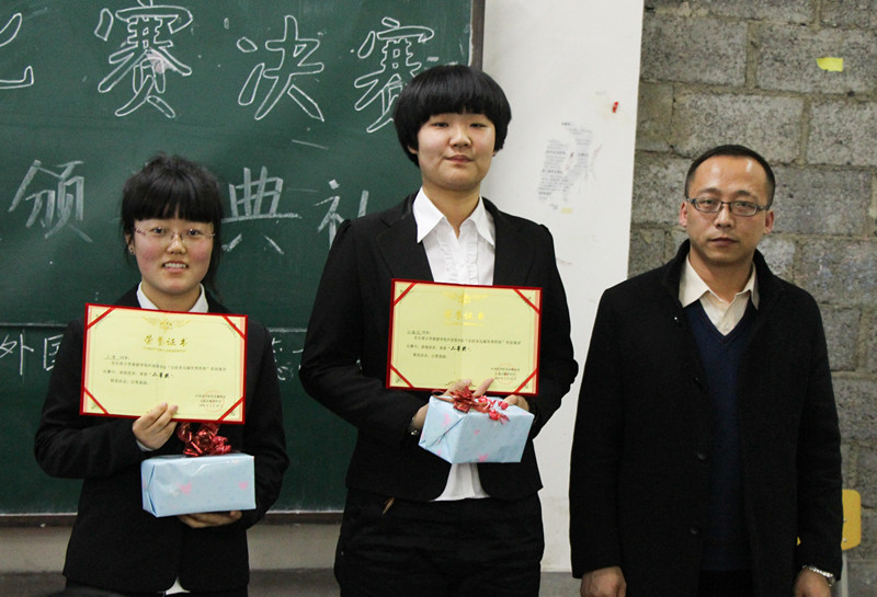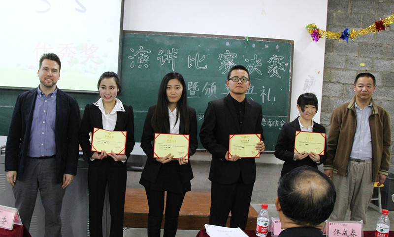 比赛正式开始,选手们一一上台演讲,接受评委老师的现场提问,选手们发挥自如,展示着自身魅力,观众们热烈的呼喊,为选手们加油、助威。最后评委从选手的语音语调,演讲技巧,肢体语言和个人形象等方面进行评判,最终2013级英语一班的王寒雨同学获得第一名,周晓莉和许可新两位老师获得“优秀指导教师”称号。常务副院长佟成春、外国语学院国际交流学院院长黄江、外国语学院副院长姚玉新和外国语学院各专业教研室的老师们为优秀指导教师和获奖选手颁奖并合影留念。活动进入尾声,英语专业外教August老师对10位选手的表现进行了点评,鼓励大家实践才是最重要的,多一些这样的机会去练习口语,使自己的水平得以提升。