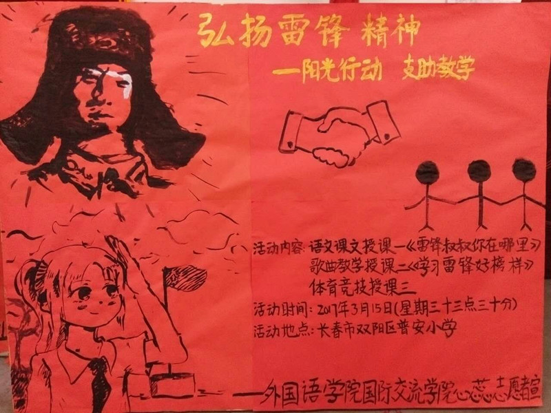 2017年3月15日,外国语学院心蕊志愿者协会举办的弘扬雷锋精神之“阳光行动,支教助学”爱心支教活动在长春市双阳区普安小学拉开序幕。参与本次支教的主要有长春大学旅游学院外国语学院心蕊志愿者协会主席陈强,秘书长董文源,及心蕊志愿者协会的一位部长、六位副部长和九名干事,志愿者们都怀着满腔热忱,积极投入到支教活动中。