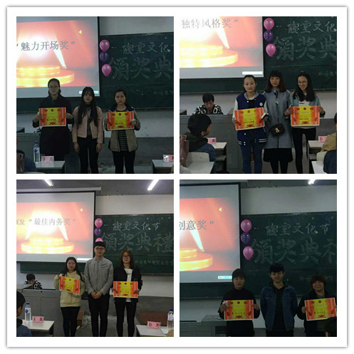 经过上学期的寝室整体展示和本学期的卫生检查,激烈的角逐后最终有15个寝室脱颖而出,分别获得了一等、二等、三等及魅力开场、独特风格、最佳内务、整体创意奖四个单项奖。获奖寝室精心制作了PPT,向在场观众进行寝室展示。整个颁奖典礼氛围活跃,有欢乐、有感动,大家一起分享寝室的快乐,叙述寝室的故事。一等奖获得寝室9公寓525 、 6公寓230的两名代表发表了获奖感言,讲述了准备过程中的点滴趣事,感叹寝室文化节活动,不仅增加了寝室同学之间的了解,更在寝室内营造了团结向上,积极奋进的氛围。