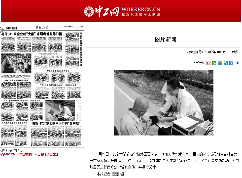 为深入学习宣传贯彻习近平总书记关于青年成长成才的一系列重要论述,引导和帮助广大青年学生在社会实践中受教育、长才干、作贡献,长春大学旅游学院外国语学院组建“暖阳天使”爱心医疗团队,开展以“喜迎十九大•青春建新功”为主题的2017年暑期“三下乡”社会实践活动。团队携手吉林省磐石市富太镇中心卫生院,为富太镇居民进行血压测量、开展夏季疾病防治和基本医疗卫生知识普及宣传、赠送家庭常备药物,切实为居民带去健康,带去关爱。此次活动得到了吉林工人日报、中工网等媒体报道。