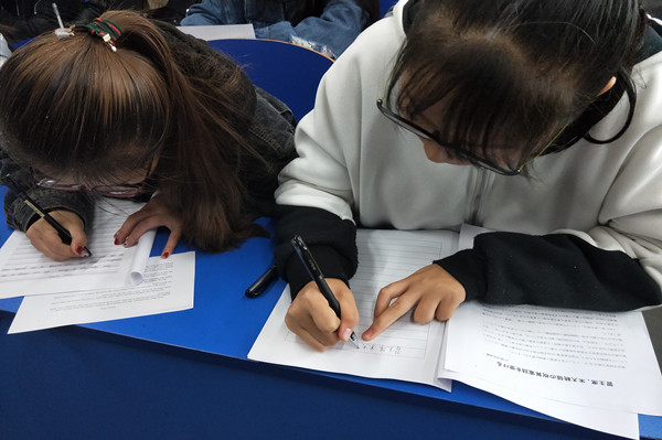 本次比赛的书写内容均为大赛委员会在各专业报送的资料中临时抽选、当场发放。参赛的学生们一丝不苟地伏案书写,教室里寂静无声,只听见笔尖在纸上“沙沙”地走着,一笔一画体现出他们的仔细与认真,一张张纸上呈现出一个个字迹工整、优美流畅的字迹。