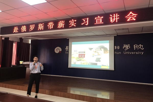 5月21日下午,为拓宽我校海外实习范围,增加学生实习就业渠道,我院在行政楼三楼报告厅召开了赴俄罗斯带薪实习宣讲会。校党委副书记、纪委书记程越、国际交流学院(处)副院长(副处长)王丹出席了本次宣讲会,我院100余名学生报名参会。