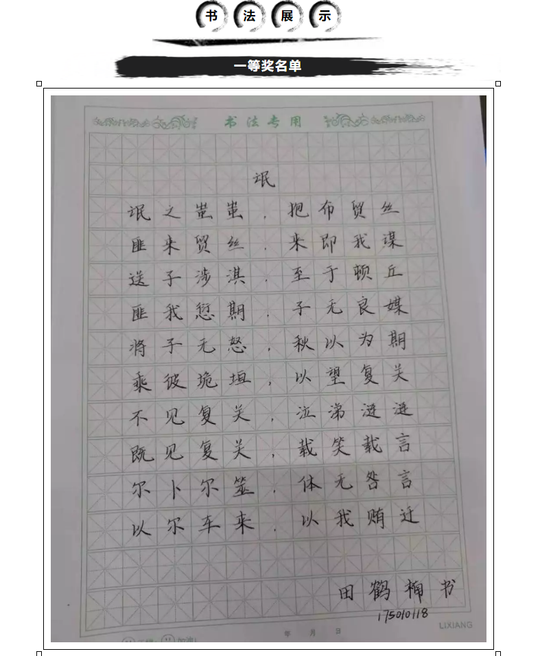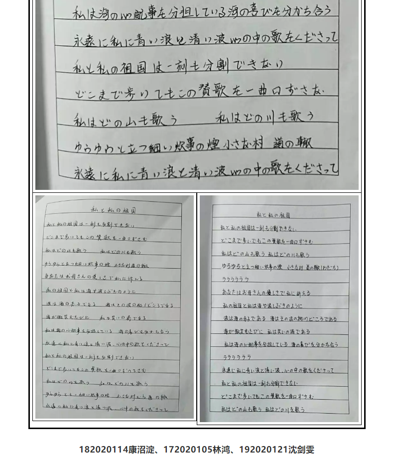 本次比赛的特色是“学而有练,学中竞比”,结合各专业课程书法的特点而展开,其中汉语教育专业比赛内容限定为中国古代诗歌,要求学生用正楷书写;英日朝俄四个专业比赛内容为翻译《我和我的祖国》歌词并进行外文书写。学生们参加热情极高,将课堂上学习到的中文软硬笔书法知识与技法、外文书写规则运用到实践当中,在规定时间内提交上多份优秀作品,很好地展示了我院学生的专业素养。