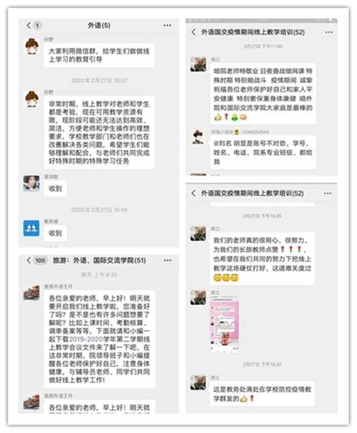特殊时期的线上教育,打破了空间局限,隔空不隔情的网络交流,关心激励学生成长,我院全体教职工以实际行动坚守教育初心,勇于担当责任。根据学校“停课不停学”、开展线上教学的相关文件精神,全体教师任劳任怨,在30多个不眠之夜里录好速课、上传资料、备好课件、学会线上教学的操作方式,“顶住压力,保障教学,让每一个学生在家好好学习”成为每一位老师的工作信念。
