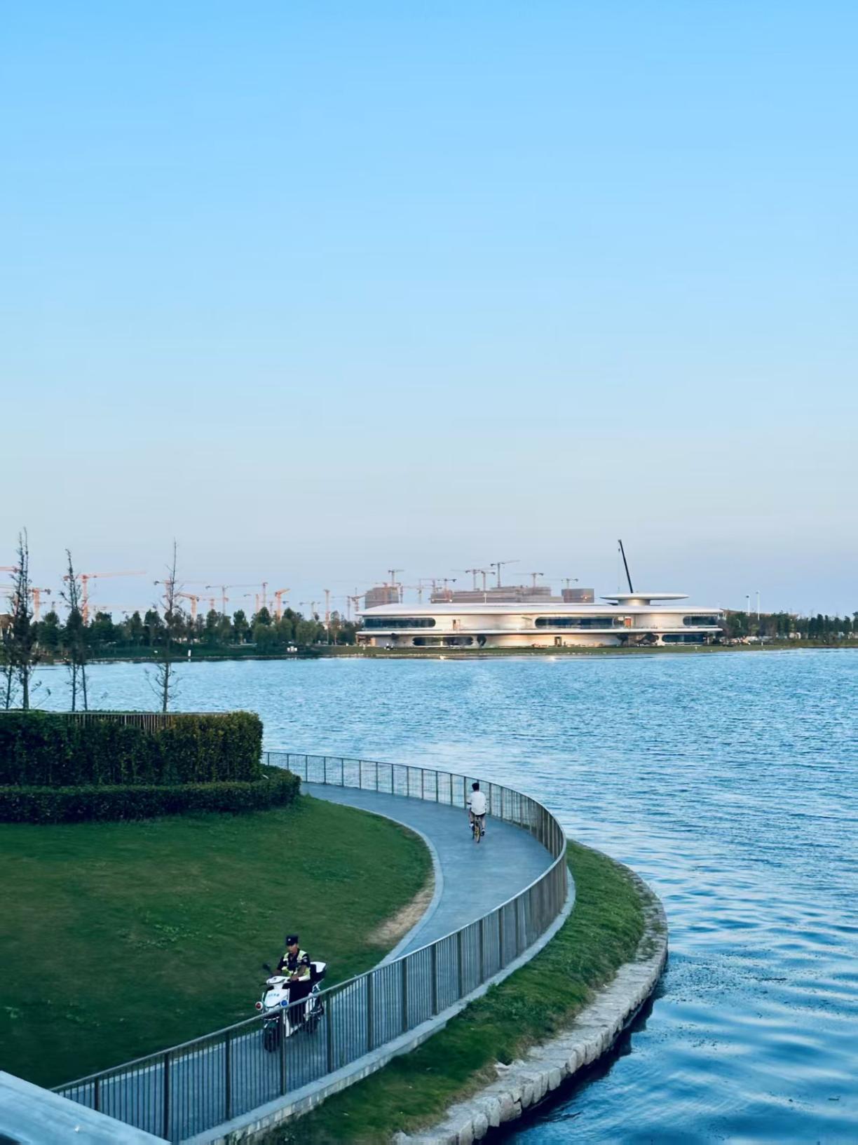 滴水湖畔的宁静:骑行滴水湖,澄澈湖水伴清新微风,远处塔吊与现代建筑,见证城市向未来生长的蓬勃朝气。