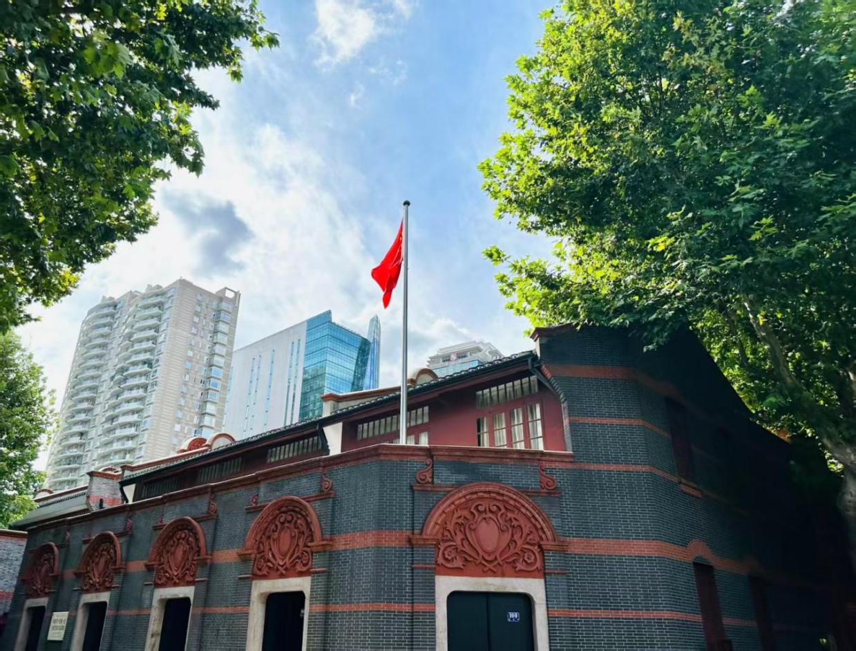 中国共产党第一次全国代表大会会址的厚重:一大会址红墙庄重,红旗飘扬,周边现代楼宇环绕,历史的开天辟地与城市发展,在此无声交融。