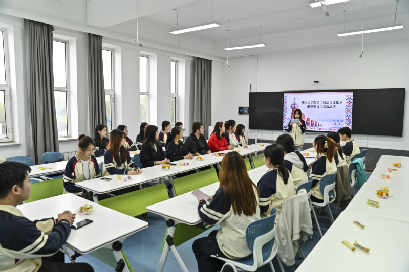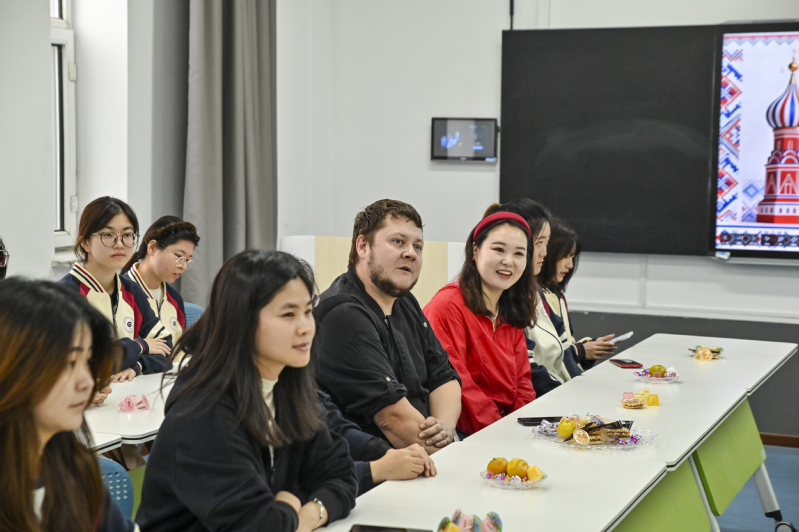 秋意渐浓的校园里,学校俄语专业学生与来自“东北亚长旅号”的俄罗斯团队嘉宾围坐,畅谈俄罗斯风情和美食文化。9月24日,由外国语学院学生工作办公室与俄语专业教研室举办的第二届语言文化节俄罗斯文化交流活动在304智慧教室举行,学院党总支书记孙野、组织员郑雨佳、俄语专业教师张莹莹一同参与,与学生们一起体验这场跨文化对话。