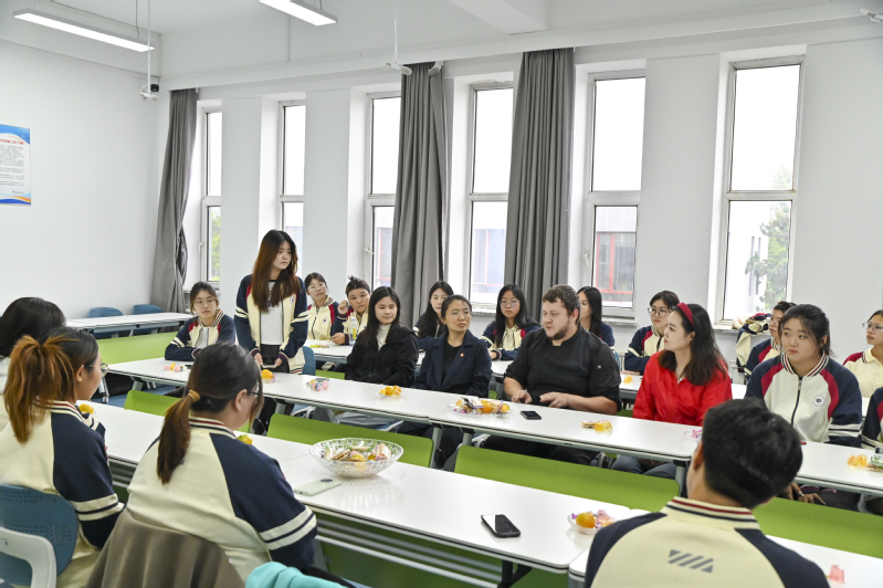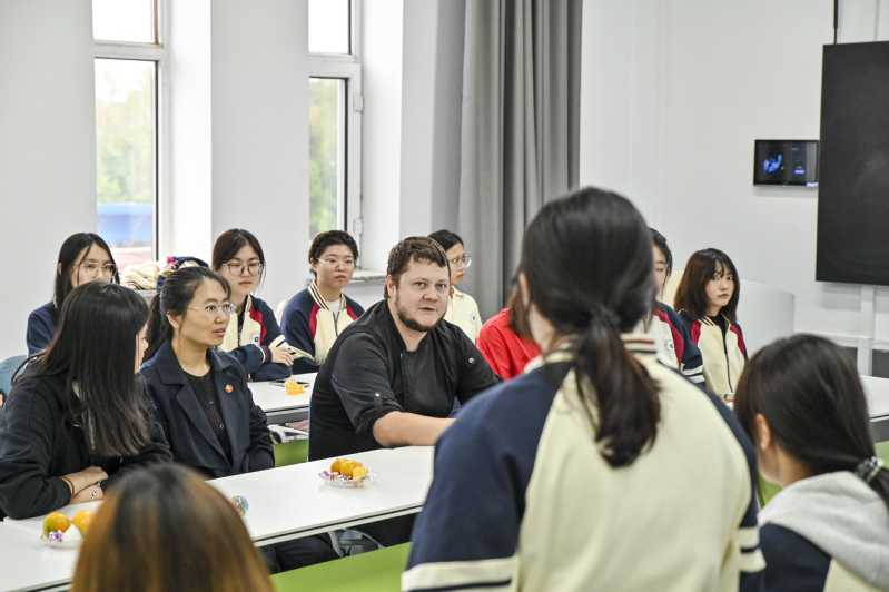 在随后互动环节中,学生们从最初的紧张羞涩到逐渐的大胆自信,纷纷基于宣传片内容和自身专业学习,就俄罗斯饮食文化、厨师团队工作体验以及“东北亚长旅号”运营情况等发起话题。俄罗斯团队成员耐心细致地解答了学生们的疑问,分享了他们在列车上的工作体验和文化交流故事,双方在轻松的氛围中互动。
