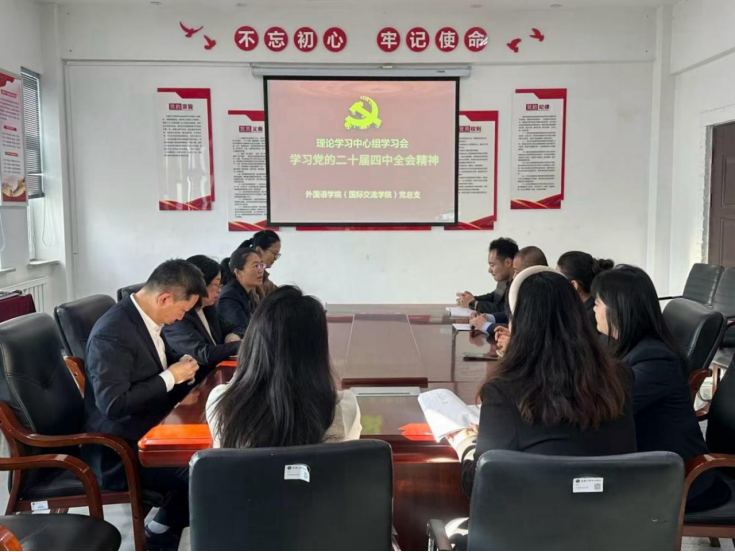 11月6日,外国语学院、国际交流学院理论学习中心组召开会议,专题学习党的二十届四中全会精神,传达学习学校党委理论学习中心组(扩大)学习会工作要求,研究部署学院贯彻落实工作。学院理论学习中心组成员参加会议,会议由学院党总支书记孙野主持。