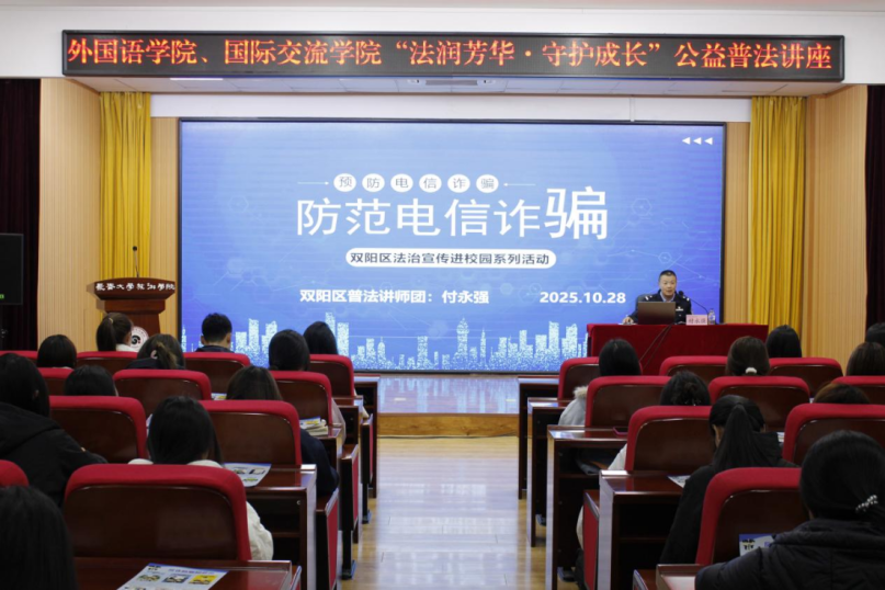 为切实提升学生防范电信网络诈骗的意识和能力,守护学生财产安全与校园稳定,10月28日,外国语学院、国际交流学院举办“法润芳华 守护成长”公益普法讲座。本次讲座特邀双阳区司法局双营司法所长付永强担任主讲人,双阳区司法局奢岭司法所所长孙甜、奢岭街道办事处妇联主席李昱、奢岭街道办事处工作人员刘钊,学院党总支书记孙野、团委书记齐柠宇、辅导员张启明、欧阳梦一共同参与。
