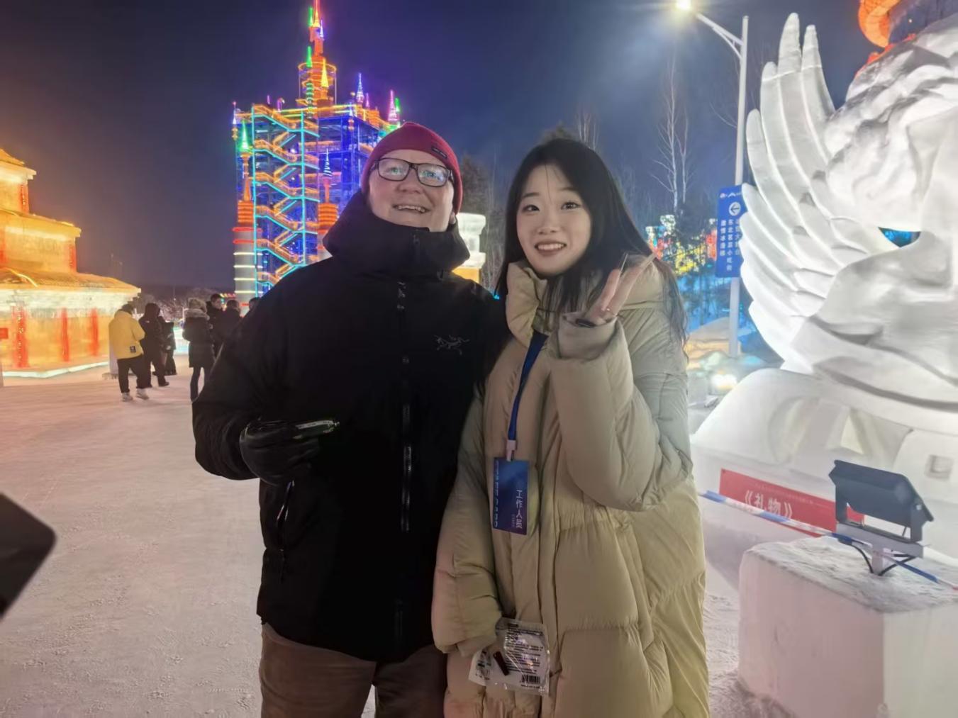 代表团实地探访环节聚焦冰雪新天地,志愿者团队全程紧随代表团步伐深耕服务。法方友人热情外向,志愿者们随即灵活调整分工,凭借实时翻译搭建沟通桥梁,精准回应各类咨询与需求。服务期间,志愿者主动分享食品,传递跨越国界的真挚善意;悉心关怀同伴,及时递上御寒物资,让互助友爱的暖流在服务现场悄然流淌。同时,团队依托前期深耕的园区脉络,科学规划最优参观动线,引导嘉宾沉浸式领略特色景致,全程实时关切需求动态,有序保障各类特色体验项目顺利开展,既筑牢参观安全防线,更让法方友人深度感受北国冰雪的雄浑壮阔与深厚文化底蕴,以全方位、高品质的协同服务,为实地考察环节注入温暖而坚实的力量。相处之中,外国友人被志愿者的专业素养与热忱态度深深打动,纷纷主动邀请志愿者合影留念,用镜头定格下这场跨国交流的美好瞬间。