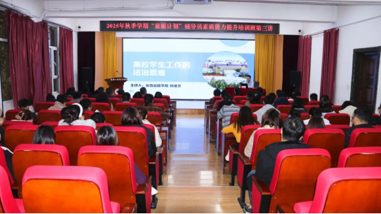 为深入学习贯彻习近平法治思想,进一步提升辅导员队伍的法治素养和依法履职能力,筑牢学生工作的法治思想防线,学校开展2025年秋季学期辅导员素质能力提升培训第三讲。本次培训由冰雪丝路学院党总支副书记孙继龙担任主讲,各学院党总支书记(副书记)、团委书记(副书记)、全体辅导员、公寓管理员60余人共同参加。培训由学生工作处副处长戴军威主持。