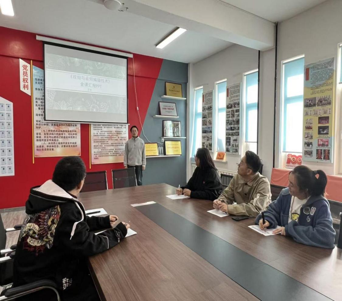 随后,王辛老师就即将结项的“金课”项目作专题汇报,全面展示了《视频与音频编辑技术》课程建设的创新实践成果。该课程建设工作以系统化、专业化为指导原则,重点围绕“项目建设进展情况”“阶段性研究成果”“教学改革成效”三大核心板块展开,形成了科学规范的建设路径。在具体实施过程中,课程团队构建了由基础到提高、由理论到实践的递进式能力培养框架,注重学生专业技能的阶梯式提升。同时,通过引入AI技术,并结合超星等线上教学平台,实现了理论教学与实践操作的有机衔接,打造线上线下多元融合的教学模式,实现从课前预习到课后拓展的全流程教学覆盖,有效提升了教学质量与学习效果。