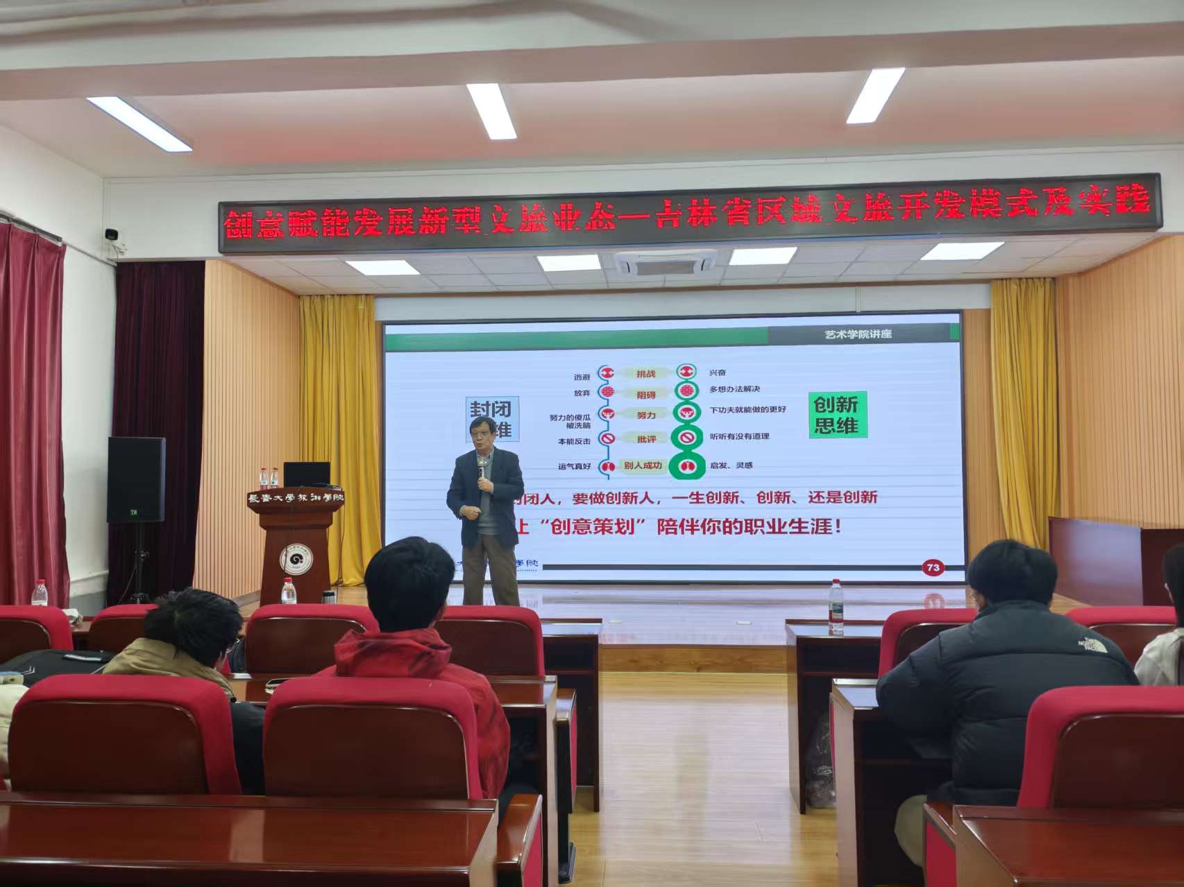 针对学生群体正在开展的老街区改造及露营地规划等课程设计项目,张春城提出了“空间即体验,设计即叙事”的核心观点。他强调,旅游空间设计应超越单一功能布局的思维框架,融入沉浸式体验与数字技术赋能等新型文旅要素,在充分满足实用需求的基础上,进一步传递文化价值。在互动环节中,学生们围绕冰雪文化融合、露营地功能优化等现实议题积极提问,张春城则结合吉林省本地文旅资源的特色,逐一作出了详尽解答。