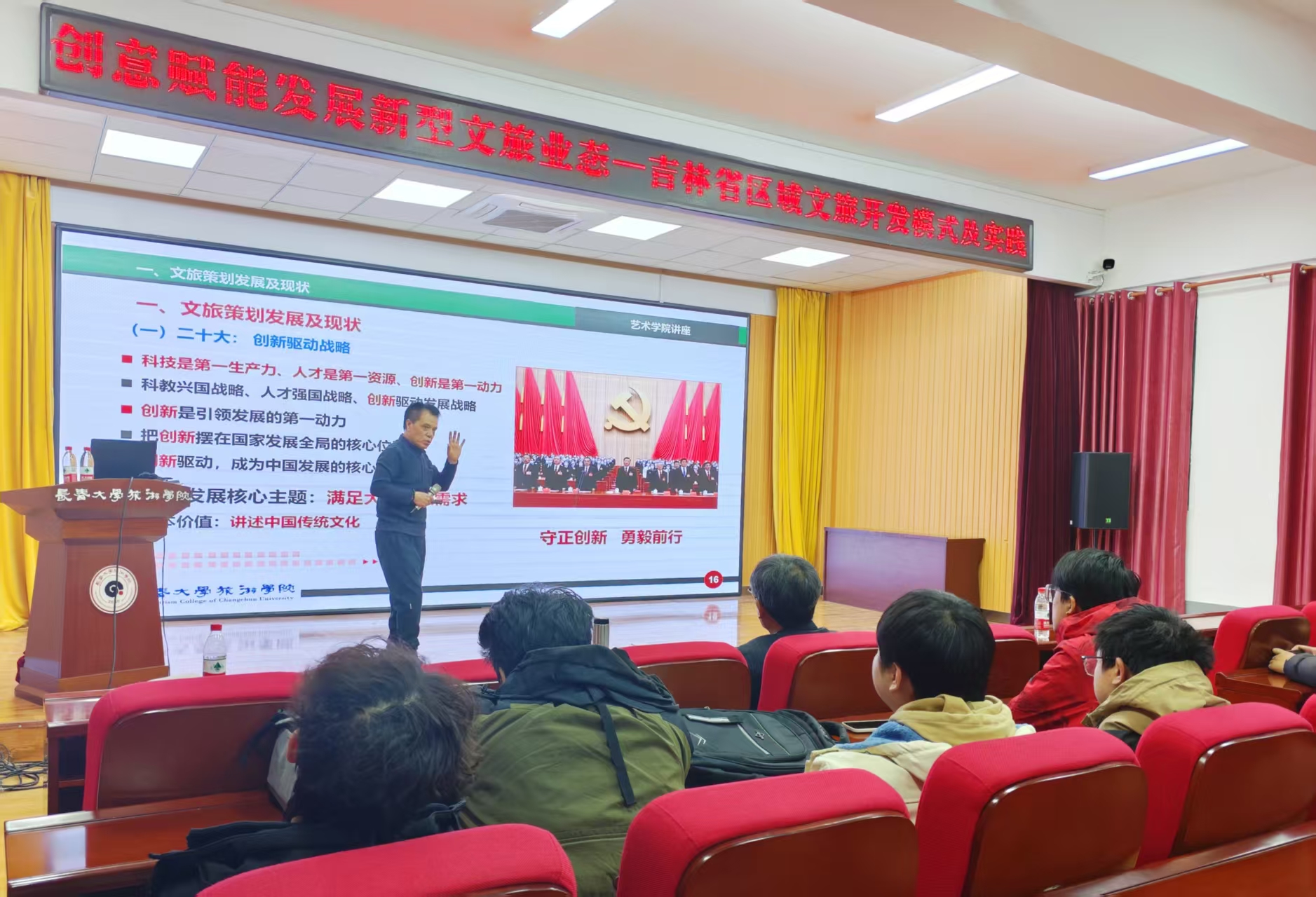 为深化“旅游文化与服务”专业集群建设、推动跨界学术交流。近日,艺术学院环境设计专业举办了“创意赋能发展新型文旅业态”专题讲座,旅游文化管理学院产业管理专业带头人张春城教授作为主讲嘉宾应邀出席,艺术学院副院长李春郁及环境设计专业师生共同参会。