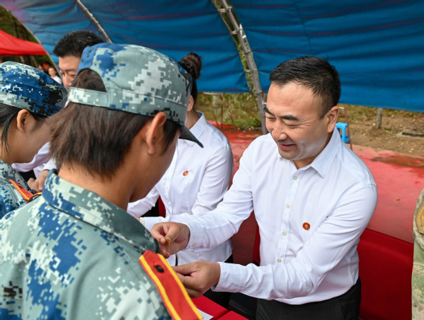 张海涛发表讲话。他首先向圆满完成军训任务的新生、取得优异成绩的先进集体和个人表示祝贺,向全体教官表示感谢。他指出,新生的到来为学校带来生机,从即日起同学们正式成为“长旅人”,开启与学校同向发展的新征程。