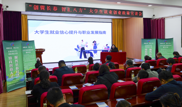 在宣讲环节,骆思锐结合多年高校政策解读经验,围绕高校毕业生等青年群体来(留)长系列优惠政策展开讲解;史艳峰以“大学生就业信心提升与职业发展指南”为主题,深入分析了2025 年全国及吉林省就业形势,还从职业核心能力培养、求职简历优化、东北企业面试特点等方面给出实用建议,为学生职业发展提供清晰路径。臧文静则聚焦“创业是更高级形式的就业”,提出从“成长、事业、财富、情感、健康”五维度规划职业生涯,并详细介绍了长春市大学生创意大赛,鼓励学生通过大赛积累经验、整合资源,激发留长创业热情。